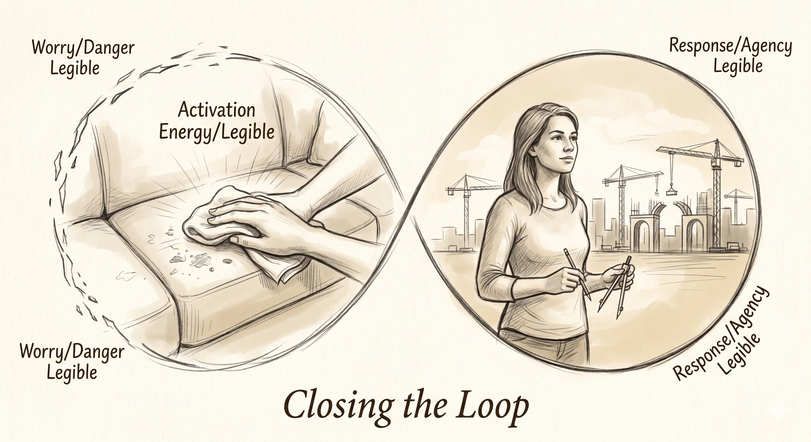 That distinction — making the response legible instead of making the danger more visible — is the move. Same mechanics. Same endless demand. But you change what’s getting cheaper. Not worry. Agency.