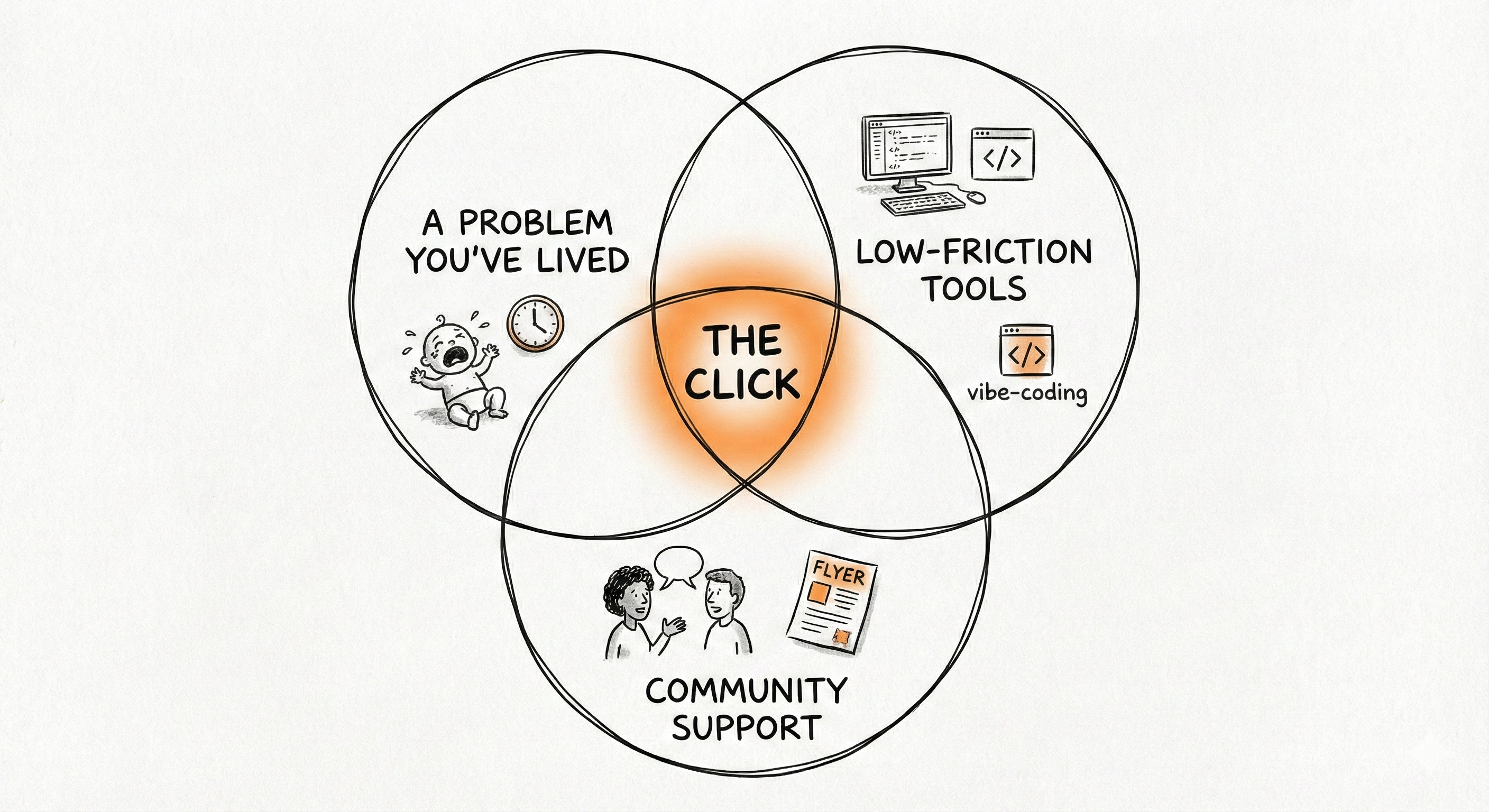 You don’t arrive at the click by thinking about it. You stumble into it by doing things. Cris didn’t sit down and brainstorm her passion. The act of vibe-coding, inspired by the memory of those 3 AM feedings, turned a wish into reality. Kyle didn’t need a new insight. He needed Sandra to see a flyer.