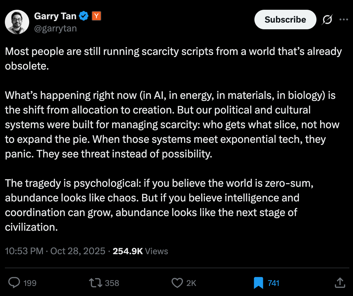 There’s a movement building around abundance — Ezra Klein and Derek Thompson have written about it, AI is accelerating it. Build more housing. Fix permitting. Make education and healthcare cheaper through technology. I believe in all of it. That’s the hardware.