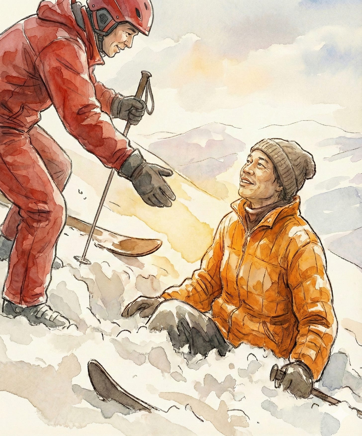 Then a stranger appeared. He side-slipped down to my skis, collected them, made his way over. I thanked him, tried to stand — and slid another five feet. He picked everything up again. No impatience, no fuss.