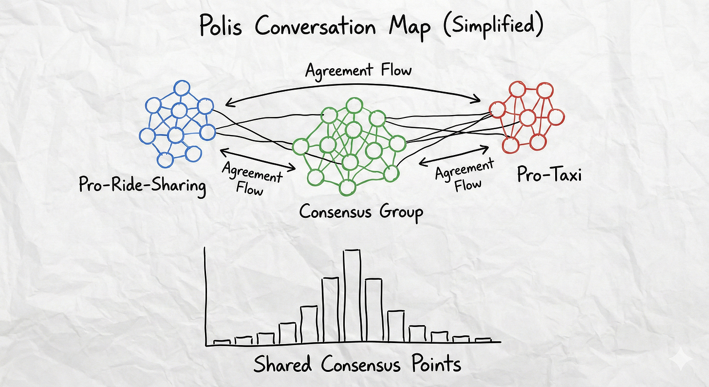 Instead, the civic tech community g0v (gov-zero) ran the dispute through vTaiwan, an open deliberation platform built on software called Polis. Over 4,000 citizens participated. Polis worked differently from social media: you could post opinions and vote on others’ statements, but you couldn’t reply. No threads, no dunking, no pile-ons. The platform visualized clusters of agreement and surfaced statements that drew support across opposing camps.